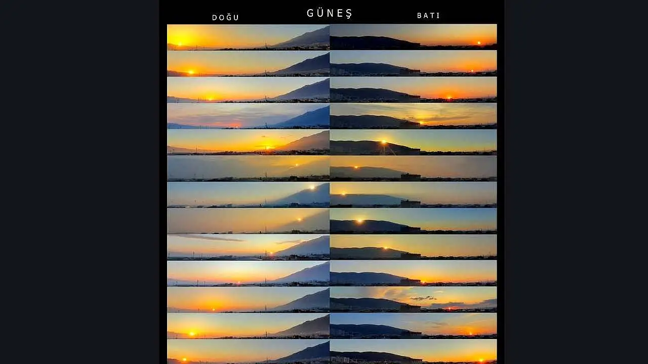 Gökyüzü meraklısı Şenol Şanlı, 1 yıl boyunca her ay doğu ve batı ufuklarından çektiği güneş fotoğraflarını tek karede birleştirerek kış ve yaz gündönümleri arasındaki hareketi gözler önüne serdi.