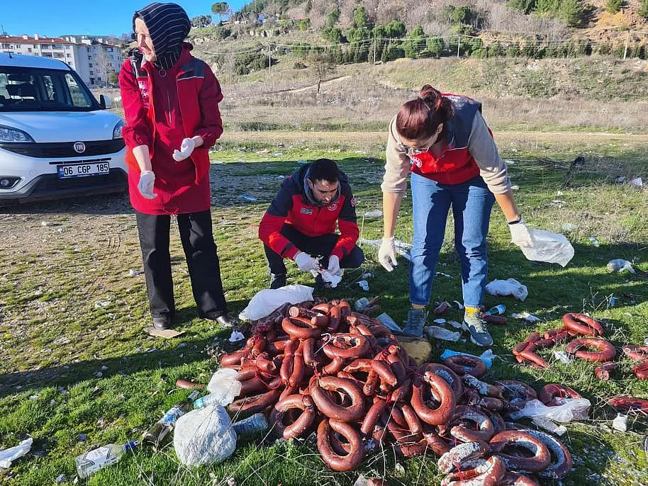 Yol kenarına atılmış yaklaşık 100 kilo etiketsiz ve bozuk sucuk ekiplerin incelemesinin ardından imha edildi.
