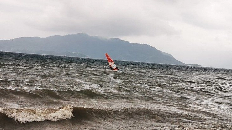 Muğla’nın Marmaris ilçesinde sabah saatlerinden bu yana etkili olan sağanak ilçe de vatandaşlara sıkıntı yaşatırken sörfçüler bu havanın keyfine varıyor. Yağmurun etkisi ile dağlardan gelen suların rengini de değiştirdiği denizde rüzgâr sörfü yapmak onlar için eziyet değil zevk.