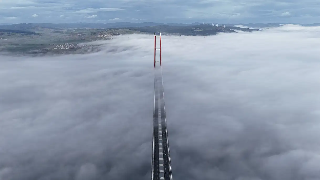 Çanakkale Boğazı'nda etkili olan sis bulutu geçişi sırasında dron ile görüntülenen 2023 metre orta açıklığıyla dünyanın en uzun orta açıklığa sahip asma köprüsü olan 1915 Çanakkale Köprüsü görüntüsüyle mest etti.