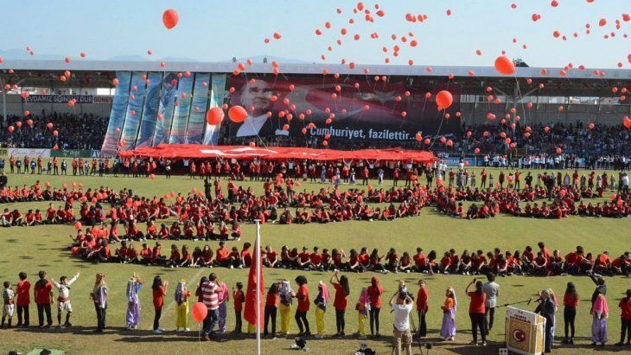 İstiklal Marşımızın söylenmesinin ardından Kaymakam Muzaffer Şahiner günün anlam ve önemini belirten konuşma yaptı. 29 Ekim Cumhuriyet Bayramı şiirsel bir anlatımla kutlanırken, Türk Hava Kurumu paramotor gösterisi ortaya güzel bir şölen koydu. Cumhuriyetin ilanının anlatıldığı gösterilerde Atatürk’e benzerliği ile dikkat çeken Necdet Bardak at üstünde stada gelince Ankaralı Seymenler tarafından karşılanışı canlandırıldı. Atatürk’ün kadına verdiği değer şiirsel dille anlatılırken, Fethiye Dağların Sultanları Kadınlar Halk Oyunları ekibi gösterisi gerçekleştirildi. Ardından Necdet Bardak, Atatürk’ün çok sevdiği Sarı Zeybek oyununu canlandırdı. Fethiye’deki kutlamada yüzlerce kırmızı balon final anında gökyüzüne bırakılırken, dev Türk Bayrakları açıldı. “Türkiye Türk’tür, Türk kalacak” şeklinde tezahüratta bulunuldu. Tören resmi geçitle sona erdi. Tören sonunda Kaymakam Muzaffer Şahiner ve Belediye Başkanı Alim Karaca ile protokol yetkilileri töreni hazırlayan öğretmen ve yöneticileri tebrik ettiler.