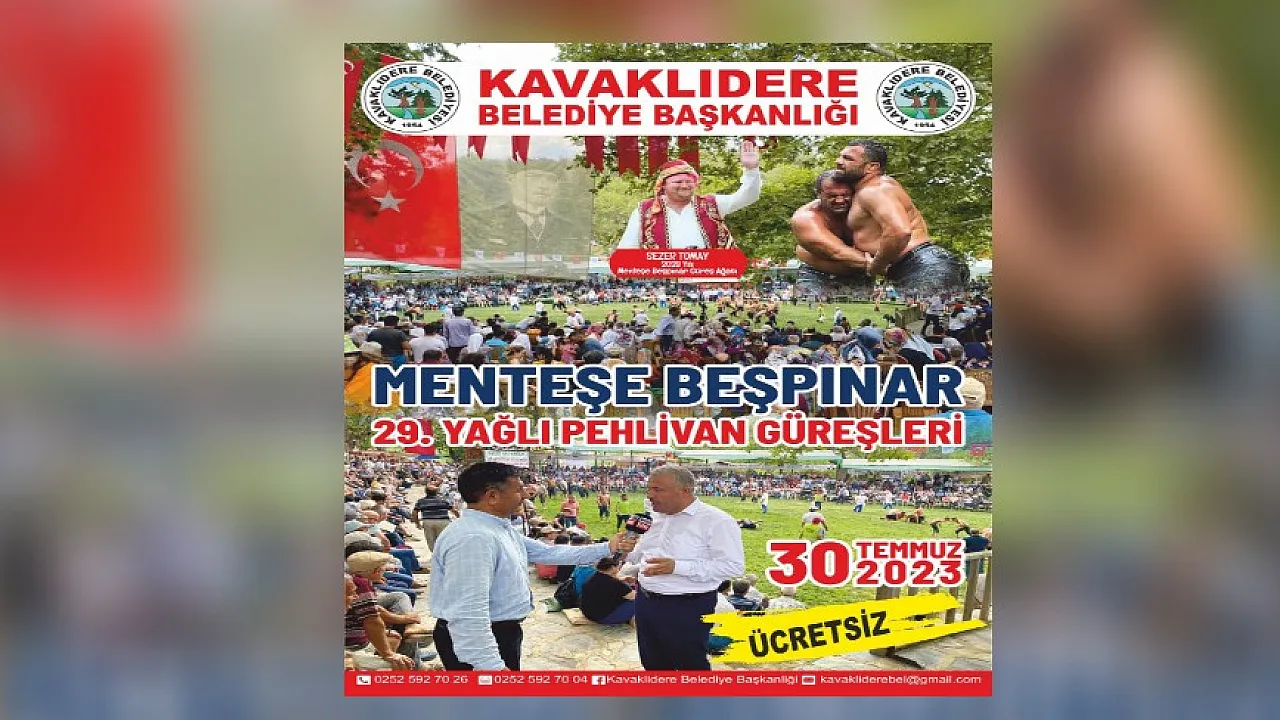 Kavaklıdere Belediye Başkanlığı tarafından 30 Temmuz 2023 Pazar Günü Menteşe Yerküpe Yaylasında gerçekleşecek olan 29'uncu Menteşe Beşpınar Yağlı Pehlivan Güreşlerine hazırlıklar sürüyor. Kavaklıdere Belediye Başkanı Mehmet Demir: “Kavaklıdere Belediye Başkanlığımızca 30 Temmuz Pazar günü ücretsiz yapılacak olan Menteşe Beşpınar Yağlı Pehlivan Güreşlerine katılımlarınıza bekliyoruz.” Dedi.