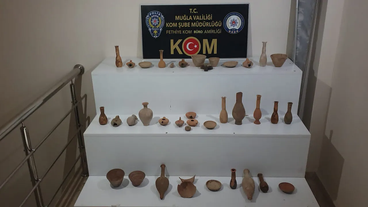 38 adet tarihi eser olduğu değerlendirilen obje ele geçirilmiş, (T.D.) ve (M.D.A) isimli şahıslar hakkında 2863 sayılı Kültür ve Tabiat Varlıklarını Koruma Kanununa Muhalefet olayından tahkikat yürütülmüş, gözaltına alınan şahıslar mevcutlu olarak Fethiye Cumhuriyet Başsavcılığına sevk edilecektir." ifadelerine yer verildi.