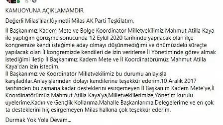Acar’ın konuyla ilgili yaptığı yazılı açıklamada "Değerli Milaslılar, Kıymetli Milas AK Parti Teşkilatım. İl Başkanımız Kadem Mete ve Bölge Koordinatör Milletvekilimiz Mahmut Atilla Kaya ile yaptığım görüşme sonucunda 12 Eylül 2020 tarihinde yapılacak olan ilçe kongremize kendi isteğimle aday olmayı düşünmediğimi ve önümüzdeki süreçte yapılacak olan İl kongremizde kendileri de izin verirlerse İl Yönetiminde görev almak istediğimi iletip İl Başkanımız Kadem Mete ve İl Koordinatörümüz Mahmut Atilla Kaya’dan izin istedim. İl Başkanımız ve Koordinatör Milletvekilimiz bu durumu anlayışla karşıladılar. Anlayışlarından dolayı kendilerine teşekkür ederim. 10 Aralık 2017 tarihinden bu zamana kadar desteklerini esirgemeyen İl Başkanım Kadem Mete’ye, İl Koordinatörümüz Mahmut Atilla Kaya’ya, Milletvekillerimize, Yönetim kurulu üyelerime, Kadın ve Gençlik Kollarıma, Mahalle Başkanlarıma, Delegelerime ve en çok ta desteklerini hiç esirgemeyen Milas halkına çok teşekkür ederim. Durmak yok yola devam" ifadelerini kullandı.