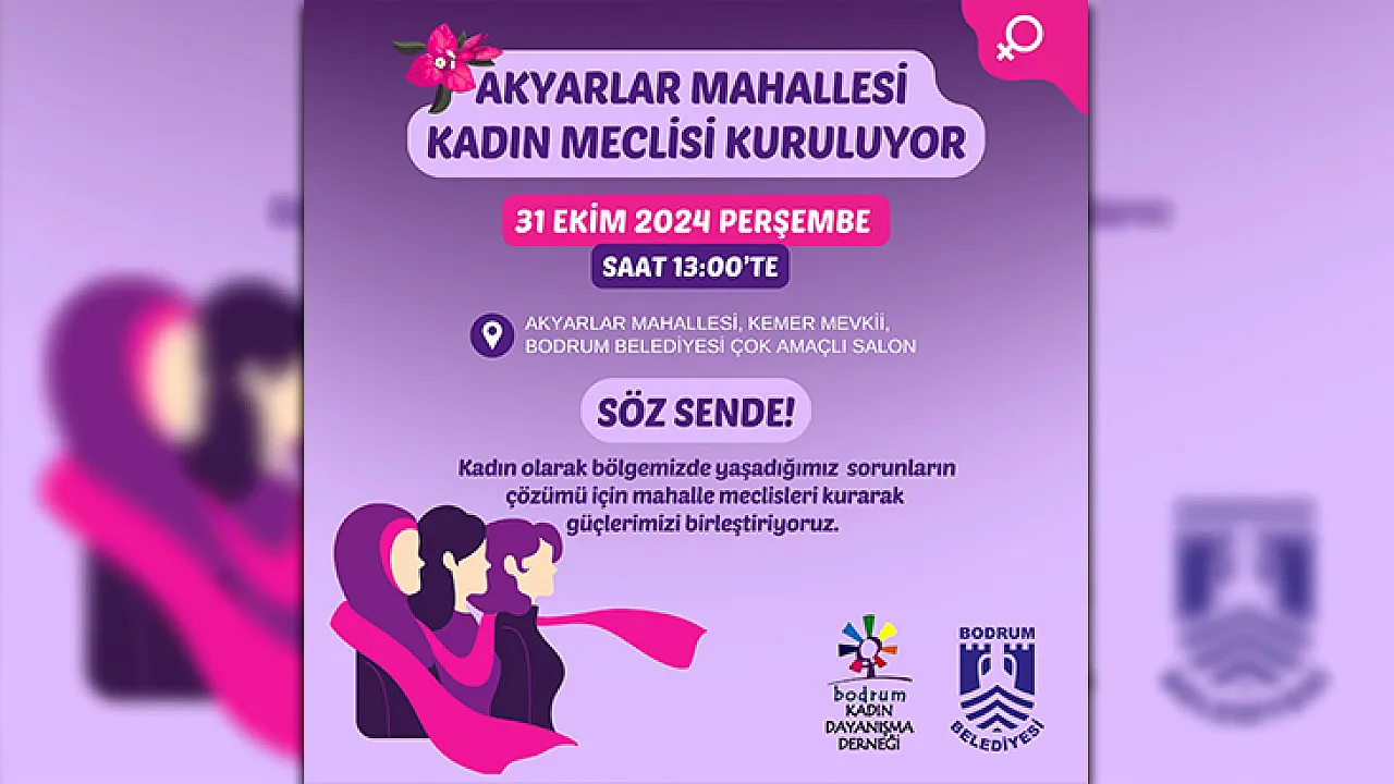 31 Ekim 2024 Perşembe günü saat 13.00’te Akyarlar Mahallesi Kemer Mevkii’nde bulunan Bodrum Belediyesi Akyarlar Çok Amaçlı Salon’da, kadınların bölgelerinde yaşadıkları sorunların çözümünde söz sahibi olmalarını destekleyen proje kapsamında toplantı düzenlenecek. Toplantıda, bölgede yaşayan kadınlar bir araya gelerek Akyarlar Mahallesi Kadın Meclisini kuracak. Kadın emeğinin yaşamın en büyük değeri olduğunu ifade eden Muhtar İsmihan Ulutaş, mahallesinde yaşayan tüm kadınları, Akyarlar Mahallesi Kadın Meclisini kurmaya davet etti.