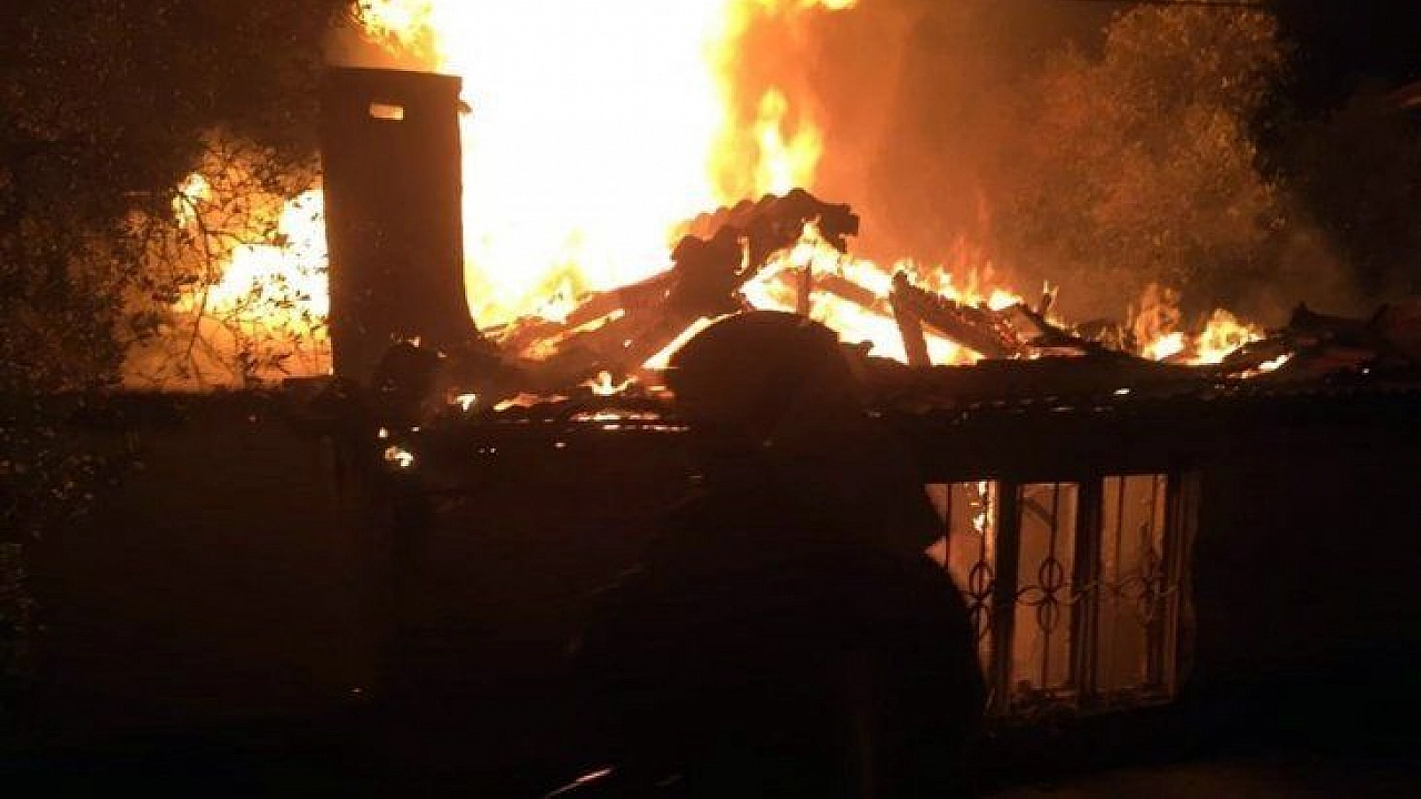 Muğla’nın Menteşe ilçesi kırsal Kafaca Mahallesinde İsmail Kallem’e ait ahşap binada çıkan yangında ev tamamen yandı.