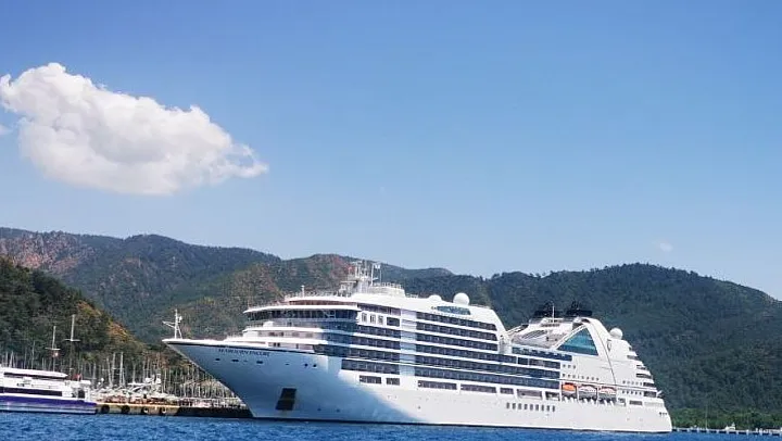 210 metre uzunluğunda, 28 metre genişliğinde lüks yüzen otel Seaborn Encore, 480 yolcusu ile Muğla'nın Marmaris ilçesi Gümrüklü Limanı'na demir attı.