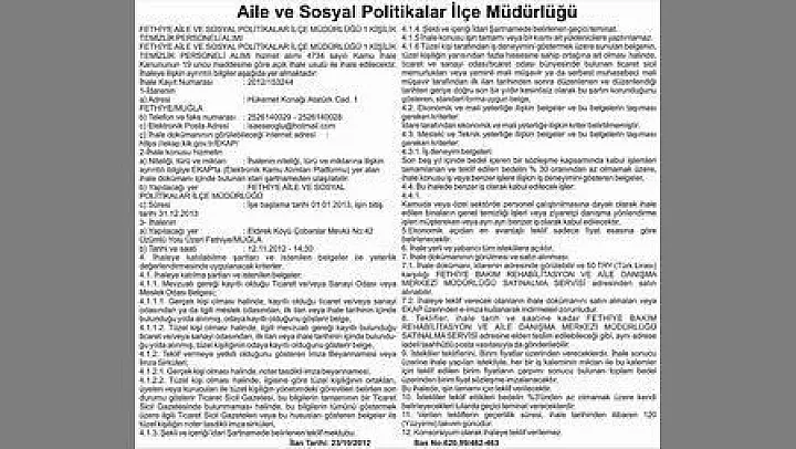 FETHİYE AİLE VE SOSYAL POLİTİKALAR İLÇE MÜDÜRLÜĞÜ 1 KİŞİLİK TEMİZLİK PERSONELİ ALIMIFETHİYE AİLE VE SOSYAL POLİTİKALAR İLÇE MÜDÜRLÜĞÜ 1 KİŞİLİK TEMİZLİK PERSONELİ ALIMI hizmet alımı 4734 sayılı Kamu İhale Kanununun 19 uncu maddesine göre açık ihale usulü ile ihale edilecektir. İhaleye ilişkin ayrıntılı bilgiler aşağıda yer almaktadır: İhale Kayıt Numarası : 2012/1532441-İdarenina) Adresi : Hükemet Konağı Atatürk Cad. 1 FETHİYE/MUĞLAb) Telefon ve faks numarası : 2526140029 - 2526140028c) Elektronik Posta Adresi : isaeseoglu@hotmail.comç) İhale dokümanının görülebileceği internet adresi : https://ekap.kik.gov.tr/EKAP/2-İhale konusu hizmetina) Niteliği, türü ve miktarı : İhalenin niteliği, türü ve miktarına ilişkin ayrıntılı bilgiye EKAP'ta (Elektronik Kamu Alımları Platformu) yer alan ihale dokümanı içinde bulunan idari şartnameden ulaşılabilir.b) Yapılacağı yer : FETHİYE AİLE VE SOSYAL POLİTİKALAR İLÇE MÜDÜRLÜĞÜc) Süresi : İşe başlama tarihi 01.01.2013, işin bitiş tarihi 31.12.20133- İhalenina) Yapılacağı yer : Eldirek Köyü Çobanlar Mevkii No:42 Üzümlü Yolu Üzeri Fethiye/MUĞLAb) Tarihi ve saati : 12.11.2012 - 14:304. İhaleye katılabilme şartları ve istenilen belgeler ile yeterlik değerlendirmesinde uygulanacak kriterler:4.1. İhaleye katılma şartları ve istenilen belgeler: 4.1.1. Mevzuatı gereği kayıtlı olduğu Ticaret ve/veya Sanayi Odası veya Meslek Odası Belgesi; 4.1.1.1. Gerçek kişi olması halinde, kayıtlı olduğu ticaret ve/veya sanayi odasından ya da ilgili meslek odasından, ilk ilan veya ihale tarihinin içinde bulunduğu yılda alınmış, odaya kayıtlı olduğunu gösterir belge, 4.1.1.2. Tüzel kişi olması halinde, ilgili mevzuatı gereği kayıtlı bulunduğu ticaret ve/veya sanayi odasından, ilk ilan veya ihale tarihinin içinde bulunduğu yılda alınmış, tüzel kişiliğinin odaya kayıtlı olduğunu gösterir belge, 4.1.2. Teklif vermeye yetkili olduğunu gösteren İmza Beyannamesi veya İmza Sirküleri; 4.1.2.1. Gerçek kişi olması halinde, noter tasdikli imza beyannamesi, 4.1.2.2. Tüzel kişi olması halinde, ilgisine göre tüzel kişiliğinin ortakları, üyeleri veya kurucuları ile tüzel kişiliğin yönetimdeki görevlileri belirten son durumu gösterir Ticaret Sicil Gazetesi, bu bilgilerin tamamının bir Ticaret Sicil Gazetesinde bulunmaması halinde, bu bilgilerin tümünü göstermek üzere ilgili Ticaret Sicil Gazeteleri veya bu hususları gösteren belgeler ile tüzel kişiliğin noter tasdikli imza sirküleri, 4.1.3. Şekli ve içeriği İdari Şartnamede belirlenen teklif mektubu. 4.1.4. Şekli ve içeriği İdari Şartnamede belirlenen geçici teminat. 4.1.5 İhale konusu işin tamamı veya bir kısmı alt yüklenicilere yaptırılamaz. 4.1.6 Tüzel kişi tarafından iş deneyimini göstermek üzere sunulan belgenin, tüzel kişiliğin yarısından fazla hissesine sahip ortağına ait olması halinde, ticaret ve sanayi odası/ticaret odası bünyesinde bulunan ticaret sicil memurlukları veya yeminli mali müşavir ya da serbest muhasebeci mali müşavir tarafından ilk ilan tarihinden sonra düzenlenen ve düzenlendiği tarihten geriye doğru son bir yıldır kesintisiz olarak bu şartın korunduğunu gösteren, standart forma uygun belge, 4.2. Ekonomik ve mali yeterliğe ilişkin belgeler ve bu belgelerin taşıması gereken kriterler:İdare tarafından ekonomik ve mali yeterliğe ilişkin kriter belirtilmemiştir.4.3. Mesleki ve Teknik yeterliğe ilişkin belgeler ve bu belgelerin taşıması gereken kriterler:4.3.1. İş deneyim belgeleri:Son beş yıl içinde bedel içeren bir sözleşme kapsamında kabul işlemleri tamamlanan ve teklif edilen bedelin % 30 oranından az olmamak üzere, ihale konusu iş veya benzer işlere ilişkin iş deneyimini gösteren belgeler, 4.4. Bu ihalede benzer iş olarak kabul edilecek işler:4.4.1.Kamuda veya özel sektörde personel çalıştırılmasına dayalı olarak ihale edilen binaların genel temizliği işleri veya ziyaretçi danışma yönlendirme işleri müştereken veya ayrı ayrı benzer iş olarak kabul edilecektir.5.Ekonomik açıdan en avantajlı teklif sadece fiyat esasına göre belirlenecektir. 6. İhale yerli ve yabancı tüm isteklilere açıktır.7. İhale dokümanının görülmesi ve satın alınması: 7.1. İhale dokümanı, idarenin adresinde görülebilir ve 50 TRY (Türk Lirası) karşılığı FETHİYE BAKIM REHABİLİTASYON VE AİLE DANIŞMA MERKEZİ MÜDÜRLÜĞÜ SATINALMA SERVİSİ adresinden satın alınabilir. 7.2. İhaleye teklif verecek olanların ihale dokümanını satın almaları veya EKAP üzerinden e-imza kullanarak indirmeleri zorunludur. 8. Teklifler, ihale tarih ve saatine kadar FETHİYE BAKIM REHABİLİTASYON VE AİLE DANIŞMA MERKEZİ MÜDÜRLÜĞÜ SATINALMA SERVİSİ adresine elden teslim edilebileceği gibi, aynı adrese iadeli taahhütlü posta vasıtasıyla da gönderilebilir. 9. İstekliler tekliflerini, Birim fiyatlar üzerinden vereceklerdir. İhale sonucu üzerine ihale yapılan istekliyle, her bir iş kaleminin miktarı ile bu kalemler için teklif edilen birim fiyatların çarpımı sonucu bulunan toplam bedel üzerinden birim fiyat sözleşme imzalanacaktır.Bu ihalede, işin tamamı için teklif verilecektir. 10. İstekliler teklif ettikleri bedelin %3'ünden az olmamak üzere kendi belirleyecekleri tutarda geçici teminat vereceklerdir. 11. Verilen tekliflerin geçerlilik süresi, ihale tarihinden itibaren 120 (Yüzyirmi) takvim günüdür. 12. Konsorsiyum olarak ihaleye teklif verilemez.İlan Tarihi: 23/10/2012 Bas No:620.99/462-463