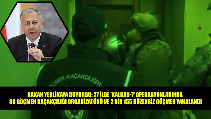 İçişleri Bakanı Yerlikaya sosyal medya hesabından yaptığı açıklamada, 2024 yılının ilk 4 gününde 27 ilde göçmen kaçakçılığı organizatörleri ve düzensiz göçmenlere yönelik gerçekleştirilen "Kalkan-7" operasyonlarında 80 göçmen kaçakçılığı organizatörü ve 2 bin 155 düzensiz göçmenin yakalandığını belirterek şu bilgileri verdi: