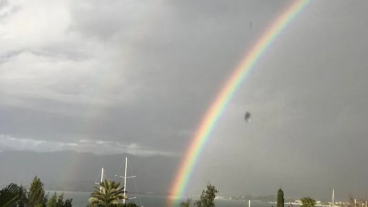 Her mevsim bir başka güzel olan Fethiye, kış mevsiminde de güzel görüntülere sahne oluyor. Yağmurlu bir günde aniden güneşin açması ile ortaya çıkan çift gökkuşağı, izleyenleri adeta büyüledi.
