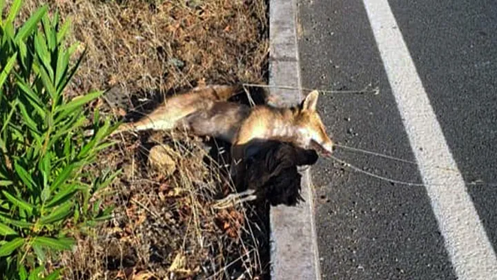 Yoldan geçen vatandaşlar, ağzında tavuk ile ölen tilkiyi cep telefonuyla görüntüledi.