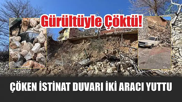 Denizli'nin Güney ilçesinde yaklaşık 5 metrelik istinat duvarının çökmesi sonucu, enkaz altında kalan iki araç kullanılamaz hale geldi.