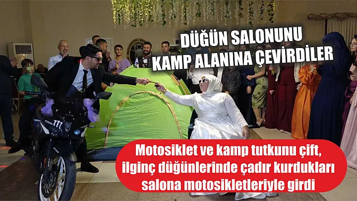 Evlenen çift, düğün salonuna çadır kurup kamp alanına çevirirken düğüne motosiklet ile geldi. Motosiklet tutkunu Doğan Mevlüt (31) ve kamp tutkunu Feyza Esra Cansız (27) çifti birbirini severek evlendi. Çift, geçtiğimiz gün dünyaevine girerken önce düğün salonunun ortasına kamp çadırı kurdu daha sonra Doğan Mevlüt, motosikletle düğün salonuna girip kamp sandalyesinde oturan eşi Feyza Esra'nın etrafında motosikletle tur attı.