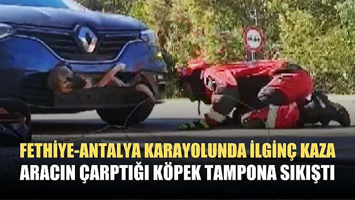 Fethiye-Antalya karayolu üzerinde seyir halinde olan otomobil, aniden önüne çıkan köpeğe çarptı. Çarpmanın etkisi ile otomobilin ön tamponuna sıkışan köpek, itfaiye ekiplerinin müdahalesi ile kurtarıldı.