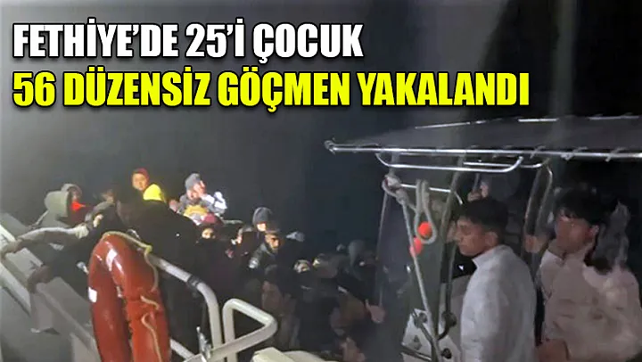 Muğla'nın Fethiye ilçesinde hareket halindeki lastik bot içinde 25'i çocuk 56 düzensiz göçmen ve 2 göçmen kaçakçılığı şüphelisi yakalandı.