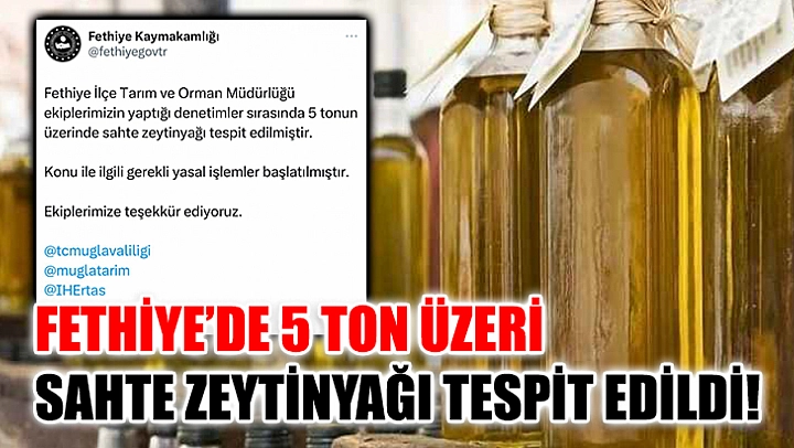 Fethiye İlçe Tarım ve Orman Müdürlüğü ekipleri denetimlerini sürdürüyor. Ekipler tarafından yapılan denetimler sonrasında Fethiye'de 5 tonun üzerinde sahte zeytinyağı tespit edildi. Yapılan bildirim sonrasında konuyla ilgili yasal işlemlerin başlatıldığı aktarıldı.