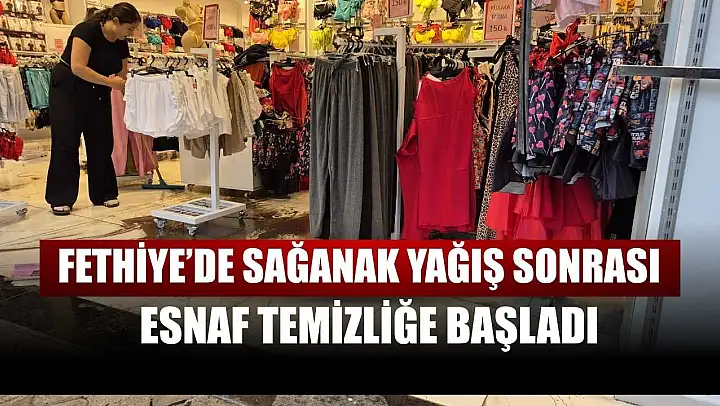Muğla'nın Fethiye ilçesinde öğle saatlerinde etkisini çokça gösteren sağanak yağış sonrası dükkanı su basan esnaflar temizliğe başladı.
