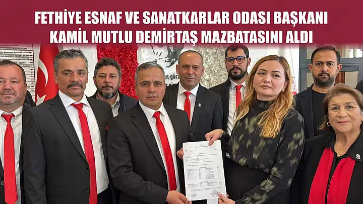 Fethiye Esnaf ve Sanatkarlar Odası'nın 20. Olağan Genel Kurulu'nda başkanlığa seçilen Kamil Mutlu Demirtaş'a mazbatası Fethiye Yüksek Seçim Kurulu tarafından tebliğ edildi.