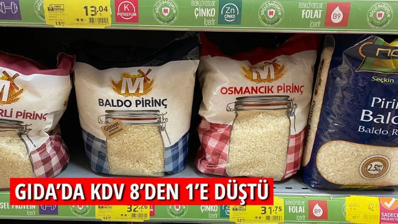 Gıda maddelerinde KDV oranında toptan perakende ayrımı kalkmış, olup oran hepsinde %1 olacak. İndirim pirinç, bulgur, nohut gibi tüm bakliyat ürünleri, su, çay, şeker, tuz, sıvı ve katı yağlar, pasta,makarna, kırmızı et, beyaz et, balık, süt, yoğurt, peynir, zeytin, yumurta, patates, soğan, biber, domates, salatalık gibi sebze ürünleri, meyveler, konserveler, turşu, salça, reçel gibi gıda maddelerinde uygulandı.
