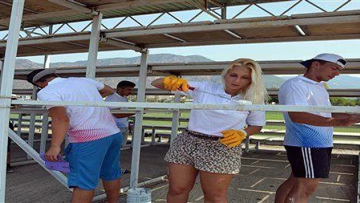 Muğla'da düzenlenen Uluslararası Gönüllü Çalışma Kampı'na Türkiye, Almanya ve Rusya'dan katılan 27 öğrenci, Köyceğiz Mehmet Özkaya Stadı'nda çevre düzenlemesi yaparak tribünleri boyadı.