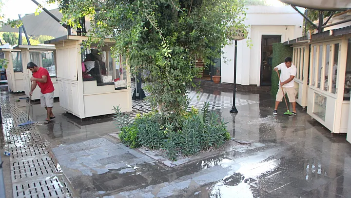 Muğla'nın Bodrum ilçesinde, isale hattında meydana gelen patlama nedeniyle iş yerlerini su bastı, araçlar hasar gördü.
