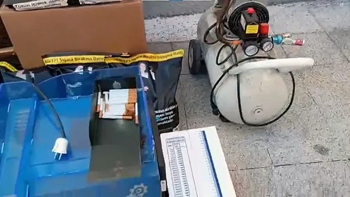 Yapılan aramada; 2 adet elektrikli sigara sarma makinesi, hava kompresörü, 120 bin adet bis makaron, 150 bin adet dolu makaron, 200 bin adet kilitli poşet ve 112 kilogram kıyılmış tütün ele geçirildi.