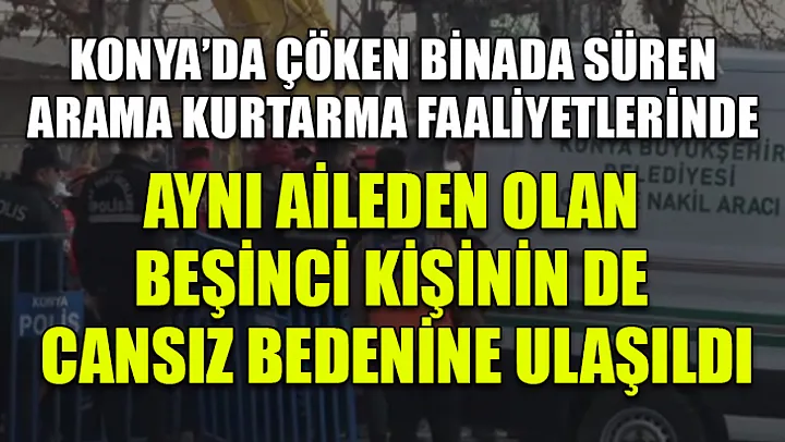Konya'nın Selçuklu ilçesinde çöken binada süren arama kurtarma faaliyetlerinde aynı aileden olan beşinci kişinin de cansız bedenine ulaşıldı.