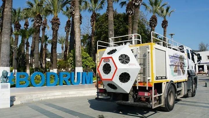 8 Ton kapasiteli araç Sağlık Bakanlığı onaylı biyosidal ürün kullanarak günde 16 saat boyunca Bodrum'da cadde ve sokakları gezerek dezenfekte işlemi gerçekleştirecek.