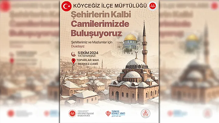 Köyceğiz İlçe Müftülüğü tarafından yapılan açıklamada; “Camilerin hayatın merkezinde konumlandırılmasını temin etmek, toplumun tüm kesimlerinin cami ve cami hizmetleriyle bağının güçlenmesini sağlamak, milli ve manevi değerlere sahip bir toplum inşa etmek amacıyla başlatılan proje kapsamında Köyceğiz Müftülüğü ‘Şehirlerin Kalbi Camide Buluşalım' programı düzenlemiş olup kız-erkek tüm gençleri 5 Ekim 2024 cumartesi günü yatsı namazında Toparlar Merkez Camiinde buluşmaya davet ediyoruz.” ifadeleri kullanıldı.