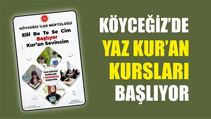 Diyanet İşleri Başkanlığınca bu yıl 7 hafta olarak planlanan Yaz Kur'an Kursları 1 Temmuz 2024 Pazartesi günü başlayacak. Köyceğiz Müftülüğüne bağlı tüm camilerde ve Kur'an Kurslarında 22 yaşına kadar olan tüm öğrenciler eğitime katılabilecek. Hafta içi beş gün yapılacak olan Yaz Kur'an Kursları 09.30'da başlayıp, saat 13.30'da sona erecek. “Şimdi Yaz Kur'an Kursu Vakti. Haydi Çocuklar Camiye. Camiler Sizinle Daha Güzel.” mottosuyla tüm öğrenciler Kur'an Kurslarına davet edildi.