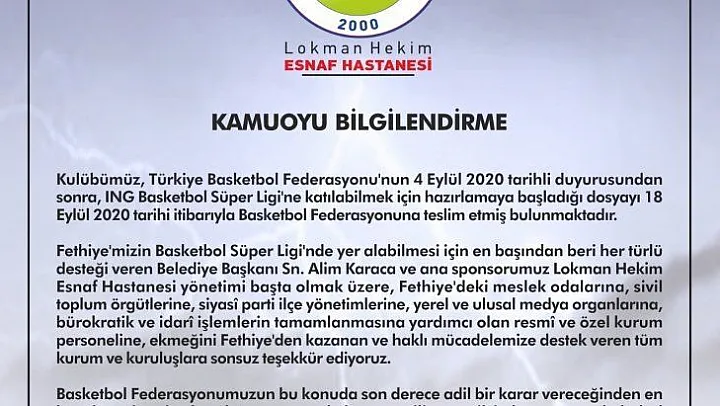 Lokman Hekim Fethiye Belediyespor Yönetim Kurulu tarafından yapılan açıklamada şu ifadelere yer verildi; “Kulübümüz, Türkiye Basketbol Federasyonu'nun 4 Eylül 2020 tarihli duyurusundan sonra, ING Basketbol Süper Ligi'ne katılabilmek için hazırlamaya başladığı dosyayı 18 Eylül 2020 tarihi itibarıyla Basketbol Federasyonuna teslim etmiş bulunmaktadır. Fethiye'mizin Basketbol Süper Ligi'nde yer alabilmesi için en başından beri her türlü desteği veren Belediye Başkanı Sn. Alim Karaca ve ana sponsorumuz Lokman Hekim Esnaf Hastanesi yönetimi başta olmak üzere, Fethiye'deki meslek odalarına, sivil toplum örgütlerine, siyasi parti ilçe yönetimlerine, yerel ve ulusal medya organlarına, bürokratik ve idarî işlemlerin tamamlanmasına yardımcı olan resmî ve özel kurum personeline, ekmeğini Fethiye'den kazanan ve haklı mücadelemize destek veren tüm kurum ve kuruluşlara sonsuz teşekkür ediyoruz. Basketbol Federasyonumuzun bu konuda son derece adil bir karar vereceğinden en küçük şüphemiz olmadığını, ne yönde karar verilirse verilsin bunu saygıyla kabul edeceğimizi peşinen beyan ederiz. ÇÜNKÜ BİZ BASKETBOLU SEVİYORUZ.”