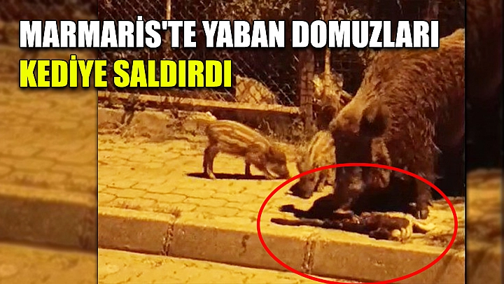 Marmaris'in Armutalan Mahallesi Tokatlılar Sitesi önünde akşam saatlerinde yaşanan olay, görenleri dehşete düşürdü. İlçe merkezine kadar inen yaban domuzları, Tokatlılar Sitesi önünde, kovalamaca sonucu yakaladıkları kediyi öldürdü. Domuz ve yavrularının kediyi parçalayıp yediği anlar, çevredeki vatandaşlar tarafından görüntülendi. Sosyal medyada paylaşılan görüntüler kısa sürede tepki topladı. Vatandaşlar, 'Yetkililer ne zaman önlem almayı düşünüyor' diyerek duruma tepki gösterdi. Özellikle gece saatlerinde sık sık mahallelerde görülen yaban domuzlarının can güvenliklerini de tehdit ettiğini belirten vatandaşlar duruma bir an önce çare bulunmasını istedi.