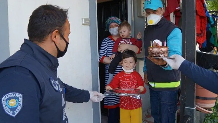 Marmaris Belediyesi Zabıta Müdürlüğü ekipleri, Temizlik İşleri Müdürlüğü görevlisi İbrahim Sezer'in oğlu 6 yaşındaki Kerem'e doğum günü sürprizi yaptı.
