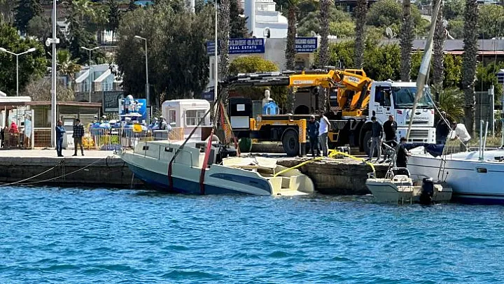 Muğla'nın Bodrum ilçesinde dün etkili olan fırtınada batan bir motoryat, vinç yardımıyla kurtarıldı.