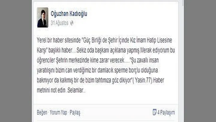 Fethiye İlçe Müftüsü Oğuzhan Kadıoğlu, kent merkezine Kız İmam Hatip Lisesi yapılması yerine Turizm işletme bölümü okulu açılmasını isteyen Fethiye Meslek Kuruluşları Güç Birliği temsilcilerine "sperm"li mesajla yanıt verdi. Fethiye Meslek Kuruluşları Güçbirliği temsilcileri, Kız İmam Hatip Lisesi'nin kent merkezine yapılması konusunda geçtiğimiz perşembe günü Deniz Ticaret Odası (DTO) Fethiye Şubesi'nde toplantı yaptı. Toplantıya, Deniz Ticaret Odası Başkanı Şaban Arıkan, Fethiye Ticaret ve Sanayi Odası Yönetim Kurulu Başkanı Akif Arıcan, Fethiye Serbest Muhasebeciler ve Mali Müşavirler Odası Başkan Yardımcısı Rıza Aydın, Fethiye Sabit ve Seyyar Pazarlar ve Manavlar Odası Başkanı Adem Hıra, İnşaat Mühendisleri Odası Fethiye Temsilciliği'nden Levent Çimen, Mimarlar Odası Fethiye Temsilciliği'nden Çiğdem Özen, Makine Mühendisleri Odası Fethiye Temsilciliği'nden Hakan Yetiş ve DTO Fethiye Şube Müdürü Bülent Telli katıldı. Toplantıda, Atatürk Caddesi'ndeki eski Fethiye Lisesi olan Fatih Anadolu Lisesi'nin Değirmenbaşı Mevkii'ne taşınması ve yerine Kız İmam Hatip Lisesi açılması konusu tartışılmıştı. Fethiye Güç Birliği Platformu adına açıklama yapan Deniz Ticaret Odası Başkanı Şaban Arıkan, meslek kuruluşları olarak Fethiye'ye Kız İmam Hatip Lisesi'nin açılmasına karşı olmadıklarını ancak ilçe merkezindeki bu okulda ara elaman ihtiyacı için Turizm işletme bölümü okulu açılmasını istediklerini söyledi. Şaban Arıkan, "Her geçen gün büyüyen ve nüfusu hızla artan Fethiye'de, ilçe merkezindeki ticari alan talebinin karşılanamaması, trafik yoğunluğu gibi sorunların bertaraf edilebilmesi için okulların şehir dışına taşınma projesi gündemdeyken, kent merkezindeki Fatih Anadolu Lisesi Binasına Kız İmamhatip Lisesi yerine Turizm İşletme Bölümü okulunun açılmasının daha uygun olacağını söyledi. Fethiye Müftüsü Oğuzhan Kadıoğluda bu açıklamanın ardından Kız İmam Hatip Lisesi'nin kent merkezine yapılmasına karşı çıkıldığını anlayarak Fethiye Meslek Kuruluşları Güç Birliği'ne, Facebook üzerinden "sperm"li mesajla yanıt verdi. Müftü Oğuzhan Kadıoğlu'nun Facebook'ta Kız İmam Hatip Lisesi konusunda şunları yazdı:"Yerel bir haber sitesinde 'Güç Birliği de Şehir İçende İmam Hatip Lisesine karşı' başlıklı haber. Sekiz oda başkanı açıklama yapmış. Merak ediyorum bu öğrenciler şehrin merkezinde kime ne zarar verecek. 'Şu zavallı insan yaratılışını bizim can verdiğimiz bir damlacık sperme borçlu olduğuna bakmıyor da kalkmış bir de bizim tahtımıza göz dikiyor' (Yasin 77). Haber metnini not edin. Selamlar yazı-nca bir tartışma başladı."Müftünün bu mesajının ardından sosyal medyada Kız İmam Hatip Lisesi'ne tepki ve destek mesajları daha fazla yer almaya başlarken şehir dışında olduğunu söyleyen Fethiye Güç Birliği Platformu ve Deniz Ticaret Odası Başkanı Şaban Arıkan; “ platform olarak en kısa sürede toplanıp bu konuyu ve sayın müftünün sosyal medyadaki paylaşımını konuşup değerlendireceğiz. Biz güç birliği olarak İmam Hatip okullarına karşı değiliz. Daha öncede defalarca söyledik. Biz 300 öğrenci için koskoca okulun Kız imam Hatip Lisesi olması yerine Fethiye Turizminin ihtiyacı olan ara eleman yetiştirilmesi için turizm işletme bölümünün bu okulda öğretim görmesini istedik. Müftü Oğuzhan Kadıoğlu'nun sanal âlemdeki değerlendirmesini arkadaşlarla toplanıp Cuma günü bizde değerlendireceğiz” dedi.