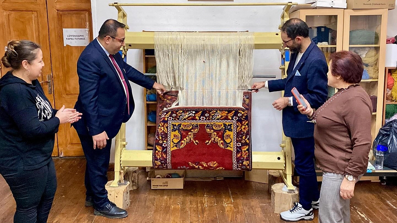 Muğla İlçe Millî Eğitim Müdürü Mehmet Keleş, Muğla Olgunlaşma Enstitüsü'nü ziyaret ederek, el emeği göz nuru ile tamamlanan geleneksel halının kesim törenine katıldı.