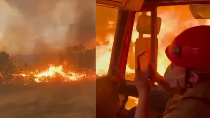 Muğla'nın Bodrum ilçesinde makilik alanda çıkan yangını söndürmek için desteğe giden Sakarya orman yangını gönülleri alevlerin arasında kaldığı anları cep telefonuyla kayda aldı.