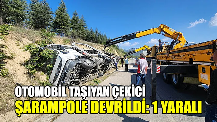 Otomobil taşıyan römorklu çekici sürücüsünün direksiyon hakimiyetini kaybetmesi sonucu şarampole devrildi. Kazada sürücü hafif yaralandı.