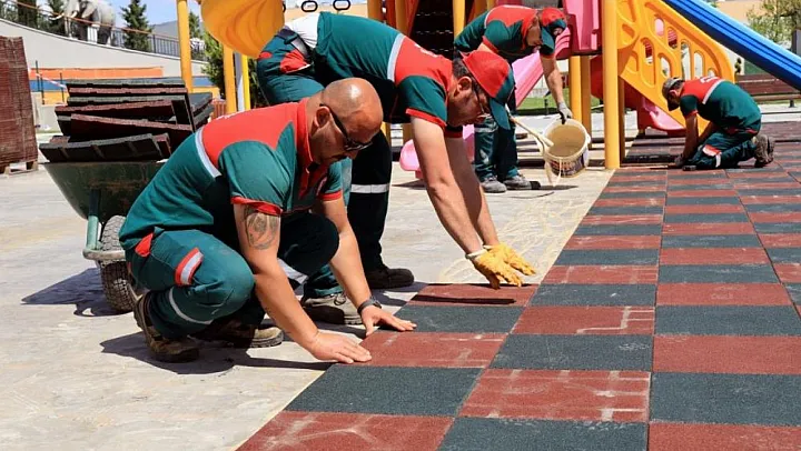 Park içerisinde zamanla eskiyen ve yıpranan zeminler kauçuk zemin kaplama malzemeleri ile yenileniyor. Yaz mevsimde parklarda daha çok vakit geçiren çocuklarımızın sağlıklı ve güvenli bir şekilde eğlenebilmeleri bizim için çok önemli. Zira çocuklarımızın eğlenirken yaralanmalarını istemeyiz. Bu nedenle zeminleri yaralanmaları önleyen kauçuk zemin kaplama ile yeniliyoruz. Çalışmalarda kırılan ve bozulan oyun gruplarının da gerekli bakım ve onarımlarını da yapıyoruz”