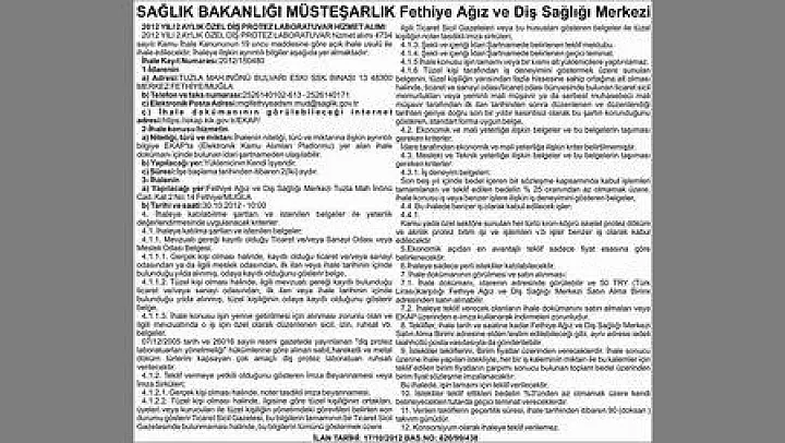 2012 YILI 2 AYLIK ÖZEL DİŞ PROTEZ LABORATUVAR HİZMET ALIMI2012 YILI 2 AYLIK ÖZEL DİŞ PROTEZ LABORATUVAR hizmet alımı 4734 sayılı Kamu İhale Kanununun 19 uncu maddesine göre açık ihale usulü ile ihale edilecektir. İhaleye ilişkin ayrıntılı bilgiler aşağıda yer almaktadır:İhale Kayıt Numarası:2012/1504801-İdarenina) Adresi:TUZLA MAH.INÖNÜ BULVARI ESKI SSK BINASI 13 48300 MERKEZ FETHİYE/MUĞLAb) Telefon ve faks numarası:2526140102-613 - 2526140171c) Elektronik Posta Adresi:mglfethiyeadsm.mud@saglik.gov.trç) İhale dokümanının görülebileceği internet adresi:https://ekap.kik.gov.tr/EKAP/2-İhale konusu hizmetina) Niteliği, türü ve miktarı:İhalenin niteliği, türü ve miktarına ilişkin ayrıntılı bilgiye EKAP'ta (Elektronik Kamu Alımları Platformu) yer alan ihale dokümanı içinde bulunan idari şartnameden ulaşılabilir.b) Yapılacağı yer:Yüklenicinin Kendi İşyeridir.c) Süresi:İşe başlama tarihinden itibaren 2(İki) aydır.3- İhalenina) Yapılacağı yer:Fethiye Ağız ve Diş Sağlığı Merkezi Tuzla Mah İnönü Cad. Kat:2 No:14 Fethiye/MUĞLAb) Tarihi ve saati:30.10.2012 - 10:004. İhaleye katılabilme şartları ve istenilen belgeler ile yeterlik değerlendirmesinde uygulanacak kriterler:4.1. İhaleye katılma şartları ve istenilen belgeler: 4.1.1. Mevzuatı gereği kayıtlı olduğu Ticaret ve/veya Sanayi Odası veya Meslek Odası Belgesi; 4.1.1.1. Gerçek kişi olması halinde, kayıtlı olduğu ticaret ve/veya sanayi odasından ya da ilgili meslek odasından, ilk ilan veya ihale tarihinin içinde bulunduğu yılda alınmış, odaya kayıtlı olduğunu gösterir belge, 4.1.1.2. Tüzel kişi olması halinde, ilgili mevzuatı gereği kayıtlı bulunduğu ticaret ve/veya sanayi odasından, ilk ilan veya ihale tarihinin içinde bulunduğu yılda alınmış, tüzel kişiliğinin odaya kayıtlı olduğunu gösterir belge, 4.1.1.3. İhale konusu işin yerine getirilmesi için alınması zorunlu olan ve ilgili mevzuatında o iş için özel olarak düzenlenen sicil, izin, ruhsat vb. belgeler,07/12/2005 tarih ve 26016 sayılı resmi gazetede yayınlanan 'diş protez laboratuarları yönetmeliği' hükümlerine göre alınan sabit,hareketli ve metal döküm türlerini kapsayan çok amaçlı diş protez laboratuarı ruhsatı verilecektir.4.1.2. Teklif vermeye yetkili olduğunu gösteren İmza Beyannamesi veya İmza Sirküleri; 4.1.2.1. Gerçek kişi olması halinde, noter tasdikli imza beyannamesi, 4.1.2.2. Tüzel kişi olması halinde, ilgisine göre tüzel kişiliğinin ortakları, üyeleri veya kurucuları ile tüzel kişiliğin yönetimdeki görevlileri belirten son durumu gösterir Ticaret Sicil Gazetesi, bu bilgilerin tamamının bir Ticaret Sicil Gazetesinde bulunmaması halinde, bu bilgilerin tümünü göstermek üzere ilgili Ticaret Sicil Gazeteleri veya bu hususları gösteren belgeler ile tüzel kişiliğin noter tasdikli imza sirküleri, 4.1.3. Şekli ve içeriği İdari Şartnamede belirlenen teklif mektubu. 4.1.4. Şekli ve içeriği İdari Şartnamede belirlenen geçici teminat. 4.1.5 İhale konusu işin tamamı veya bir kısmı alt yüklenicilere yaptırılamaz. 4.1.6 Tüzel kişi tarafından iş deneyimini göstermek üzere sunulan belgenin, tüzel kişiliğin yarısından fazla hissesine sahip ortağına ait olması halinde, ticaret ve sanayi odası/ticaret odası bünyesinde bulunan ticaret sicil memurlukları veya yeminli mali müşavir ya da serbest muhasebeci mali müşavir tarafından ilk ilan tarihinden sonra düzenlenen ve düzenlendiği tarihten geriye doğru son bir yıldır kesintisiz olarak bu şartın korunduğunu gösteren, standart forma uygun belge, 4.2. Ekonomik ve mali yeterliğe ilişkin belgeler ve bu belgelerin taşıması gereken kriterler:İdare tarafından ekonomik ve mali yeterliğe ilişkin kriter belirtilmemiştir.4.3. Mesleki ve Teknik yeterliğe ilişkin belgeler ve bu belgelerin taşıması gereken kriterler:4.3.1. İş deneyim belgeleri:Son beş yıl içinde bedel içeren bir sözleşme kapsamında kabul işlemleri tamamlanan ve teklif edilen bedelin % 25 oranından az olmamak üzere, ihale konusu iş veya benzer işlere ilişkin iş deneyimini gösteren belgeler, 4.4. Bu ihalede benzer iş olarak kabul edilecek işler:4.4.1.Kamu yada özel sektöre sunulan her türlü kron-köprü iskelet protez döküm ve akrilik protez bitim işi ve işlemleri v.b işler benzer iş olarak kabul edilecektir5.Ekonomik açıdan en avantajlı teklif sadece fiyat esasına göre belirlenecektir. 6.İhaleye sadece yerli istekliler katılabilecektir. 7. İhale dokümanının görülmesi ve satın alınması: 7.1. İhale dokümanı, idarenin adresinde görülebilir ve 50 TRY (Türk Lirası)karşılığı Fethiye Ağız ve Diş Sağlığı Merkezi Satın Alma Birimi adresinden satın alınabilir. 7.2. İhaleye teklif verecek olanların ihale dokümanını satın almaları veya EKAP üzerinden e-imza kullanarak indirmeleri zorunludur. 8. Teklifler, ihale tarih ve saatine kadar Fethiye Ağız ve Diş Sağlığı Merkezi Satın Alma Birimi adresine elden teslim edilebileceği gibi, aynı adrese iadeli taahhütlü posta vasıtasıyla da gönderilebilir. 9. İstekliler tekliflerini, Birim fiyatlar üzerinden vereceklerdir. İhale sonucu üzerine ihale yapılan istekliyle, her bir iş kaleminin miktarı ile bu kalemler için teklif edilen birim fiyatların çarpımı sonucu bulunan toplam bedel üzerinden birim fiyat sözleşme imzalanacaktır.Bu ihalede, işin tamamı için teklif verilecektir. 10. İstekliler teklif ettikleri bedelin %3'ünden az olmamak üzere kendi belirleyecekleri tutarda geçici teminat vereceklerdir. 11. Verilen tekliflerin geçerlilik süresi, ihale tarihinden itibaren 90 (doksan ) takvim günüdür. 12. Konsorsiyum olarak ihaleye teklif verilemez.İLAN TARİHİ: 17/10/2012 BAS.NO: 620/99/438