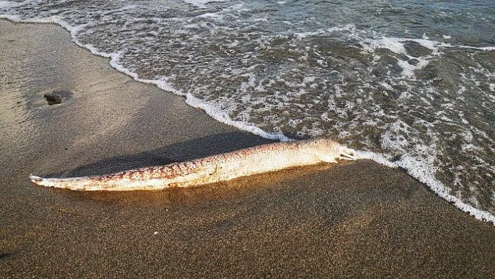 Öğlen saatlerinde gezintiye çıkan vatandaşlar, kıyıya vurmuş balığı görünce hemen kameralarını ellerine alıp korkutucu balığın fotoğraf ve videolarını çekip ne olduğunu merak ettiler. Çene kısmından birazının kediler tarafından yendiği görülen balığın balıkçıların paraketesinden kurtulup sahile vurmuş olduğu düşünülüyor. Bir metreden uzun olan ve yaklaşık dokuz kilo ağırlığında olduğu görüldü.