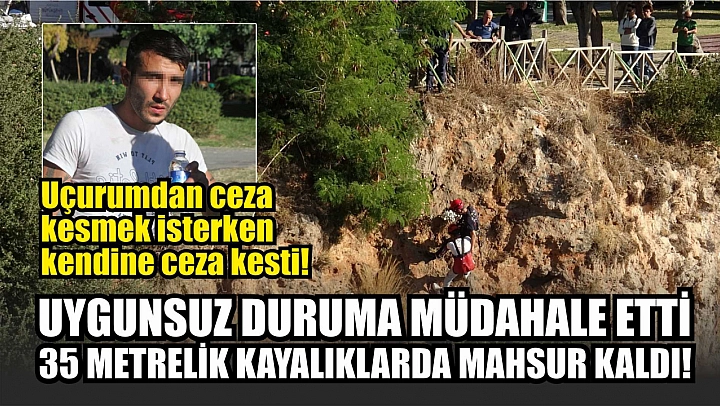 Bir şahıs, uygunsuz halde gördüğü kişileri uyarmak için 35 metre yükseklikteki bir uçurumdan kayalıklara indi. Kayalıklarda mahsur kalan ve yardım çığlıkları atan genci itfaiye ekipleri kurtardı. Kurtarıldıktan sonra konuşan genç, 'Aşağıda terbiyesiz bir adam vardı, ona ceza keseyim derken yanlışlıkla kendime ceza kestim' dedi.