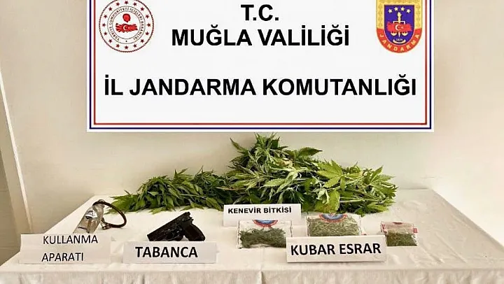 Bodrum İlçe Jandarma Komutanlığınca yapılan istihbari çalışmalar sonucu, Güvercinlik Mahallesinde ikamet eden N.A. isimli şahsın uyuşturucu madde ticareti yaptığı bilgisi alındı. Dün Bodrum İlçe Jandarma ekiplerince şahsın ikametine operasyon düzenlendi. İkamette yapılan aramada, bir miktar kubar esrar, 10 kök kenevir bitkisi, 1 adet uyuşturucu madde kullanma aparatı ve 1 adet 9 mm çapında ruhsatsız tabanca ele geçirildi. N.A., “Uyuşturucu Madde İmal ve Ticareti” suçundan gözaltına alınırken Bodrum Cumhuriyet Başsavcılığınca olayla ilgili soruşturma başlatıldı.