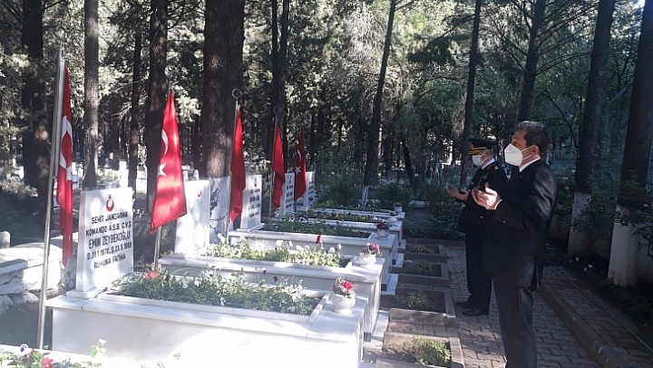 Muğla Valisi Orhan Tavlı, İl Jandarma Komutanı Tuğgeneral Yusuf Kenan Topçu ile birlikte Ramazan Bayramında şehitlikleri ziyaret etti.