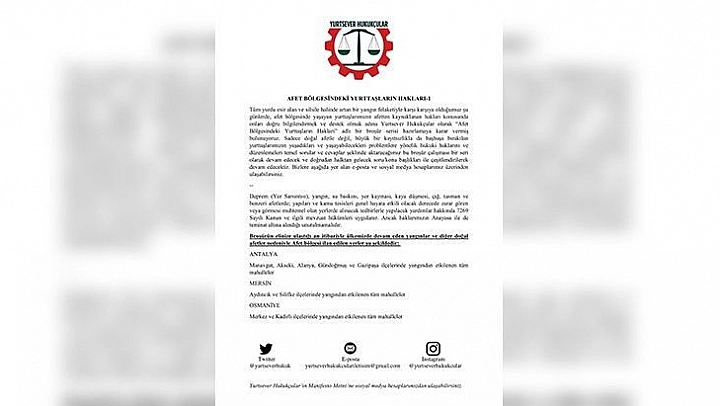 Tüm yurdu esir alan ve silsile halinde artan bir yangın felaketiyle karşı karşıya olduğumuz şu günlerde, afet bölgesinde yaşayan yurttaşlarımızın afetten kaynaklanan hakları konusunda onları doğru bilgilendirmek ve destek olmak adına Yurtsever Hukukçular olarak 'Afet Bölgesindeki Yurttaşların Hakları' adlı bir broşür serisi hazırlamaya karar vermiş bulunuyoruz.