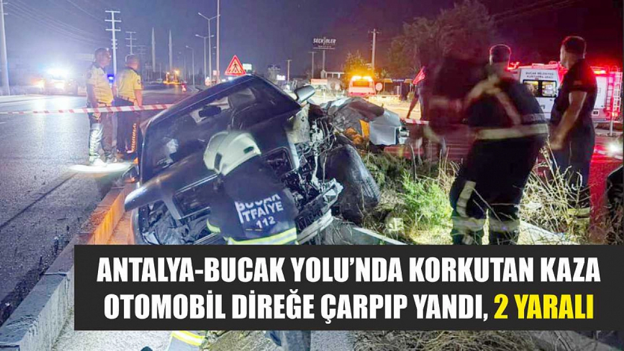Antalya-Bucak Karayolu'nda kontrolden çıkarak refüjdeki aydınlatma direğine çapan otomobil alev aldı. Çevredekiler tarafından alev alan araçtan çıkarılan 2 kişi hastaneye kaldırıldı.