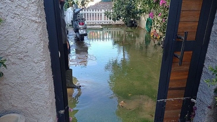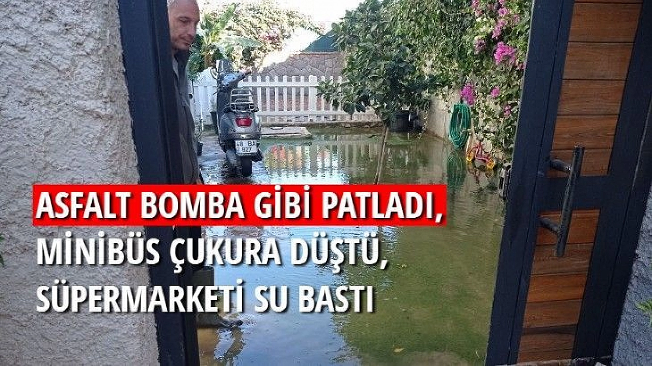 Muğla'nın Bodrum ilçesinde iki ayrı noktada patlayan isale hattından çıkan sular bir süpermarket ile evin bahçesini bastı. Patlağın olduğu noktada minibüs yan yattı.