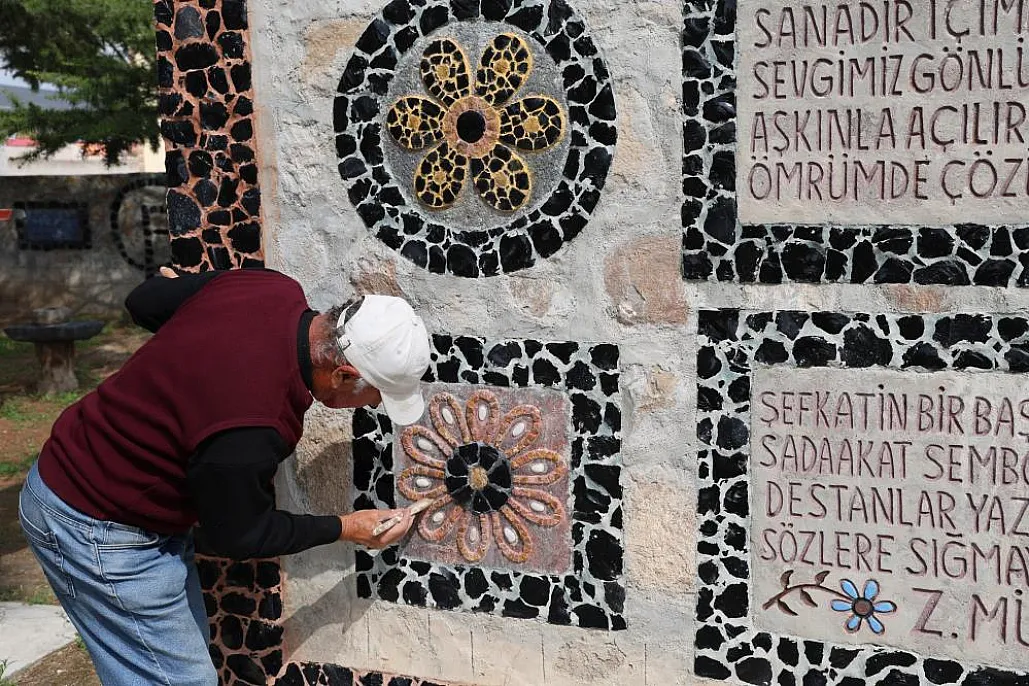 74 yaşındaki Rafet Topraktepe, üç yıl önce kaybettiği eşine olan aşkını taşlara kazıyarak bahçesine bir anıt park yaptı. 500 kiloluk taşları işleyerek oluşturduğu park, görenleri duygulandırıyor.