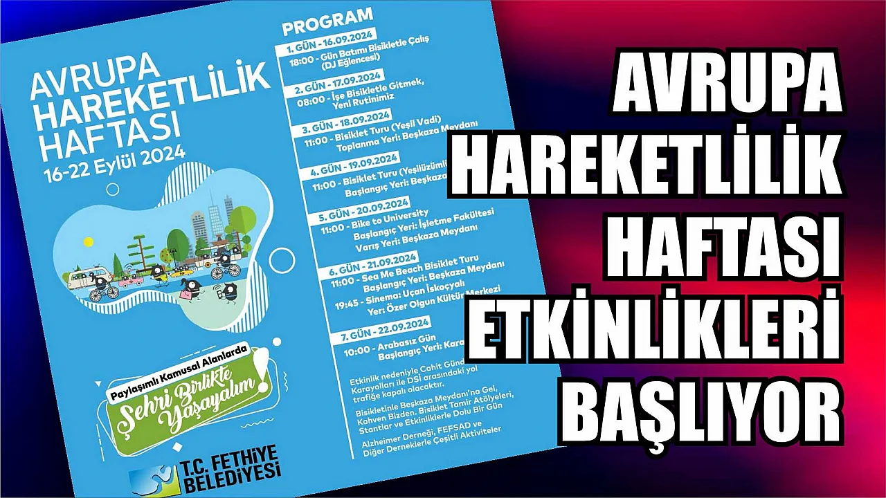 Sürdürülebilir kentsel ulaşımı teşvik etmenin yanı sıra sağlıklı yaşam konularında farkındalık yaratmayı yönelik bir organizasyon olan Avrupa Hareketlilik Haftası etkinlikleri başlıyor. Fethiye Belediyesi, Avrupa Hareketlilik Haftası kapsamında sürdürülebilir ulaşımı teşvik etmek ve çevre dostu ulaşım alışkanlıklarının yaygınlaştırılmasını hedefliyor.