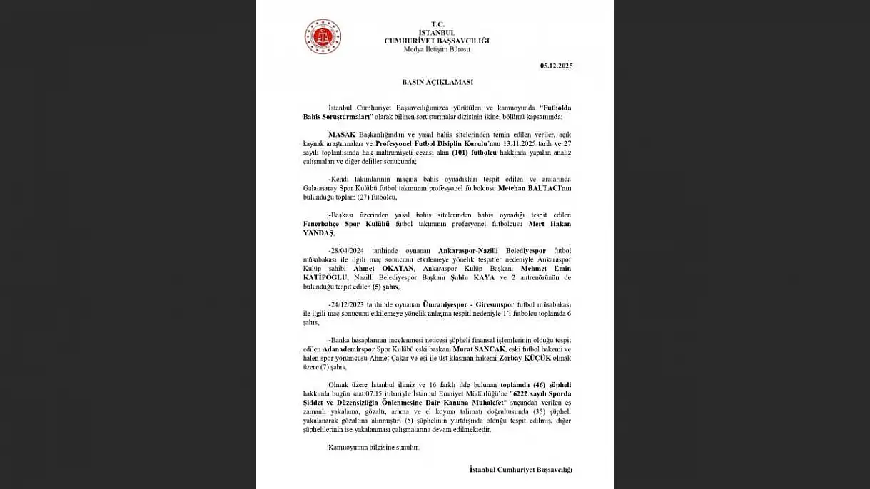İstanbul Cumhuriyet Başsavcılığı, Türk futbolunda büyük yankı uyandıran 'futbolda bahis' soruşturmasının ikinci aşamasına ilişkin detayları kamuoyu ile paylaştı. Başsavcılığın açıklamasına göre, toplam 46 şüpheli hakkında yakalama kararı çıkarılırken, bu isimlerden 35'i sabah saatlerinde düzenlenen eş zamanlı operasyonlarla gözaltına alındı. Gözaltına alınanlar arasında Süper Lig futbolcuları Mert Hakan Yandaş ve Metehan Baltacı da bulunuyor.